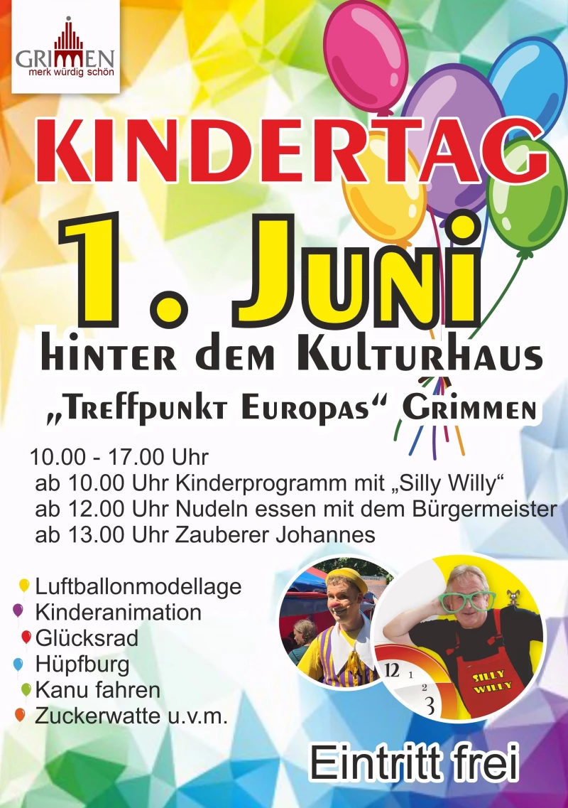 Am Internationalen Kindertag, dem 01.06.2025 sind alle Kinder, Eltern und Großeltern recht herzlich zu einem bunten Tag mit Spiel und Spaß auf dem Außengelände vor dem Vereinshaus in der Erich-Weinert-Straße 23 eingeladen. Die Stadt Grimmen veranstaltet in der Zeit von 10:00 bis ca. 16:00 Uhr die traditionelle Kindertagsparty mit dem großen Nudelessen. Wie schon in den Vorjahren werden auch Kinderanimationen von Holger Pautz als Zauberer Johannes u.a. angeboten. Kulinarisches wird es an vielen Ständen geben, deshalb sollten die Kinder etwas Taschengeld mitbringen. Also, liebe Kinder, wenn ihr eine tolle Kindertagsparty erleben wollt, kommt am 01. Juni 2025 zum Vereinshaus.